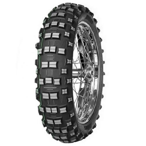 - O pneu Mitas TERRA FORCE-EF Super, reconhecível por sua faixa verde, é projetado para corridas de enduro mais difíceis;